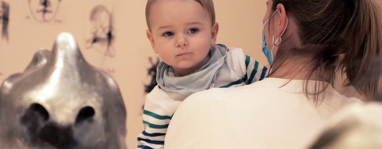 Die Kuratoren Christian Bauer und Berthold Ecker telefonieren mit der Künstlerin Lieselott Beschorner. Währenddessen sieht sich der wohl süßeste Museumsbesucher die Ausstellung an.