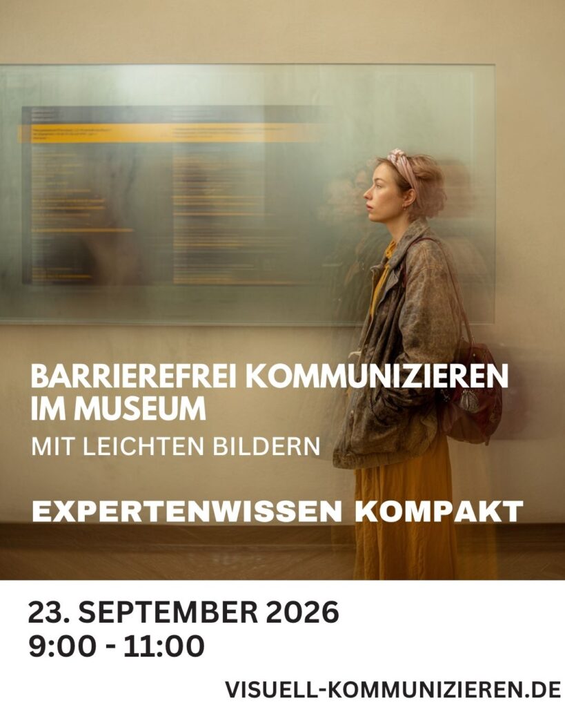 Eine Frau steht im Museum. Die Tafeln im Hintergrund sind unscharf. Auf dem Bild steht: Barrierefrei kommunizieren im Museum mit Leichten Bildern. Expertenwissen kompakt. Workshop am 23. Septemner 9 - 11 Uhr