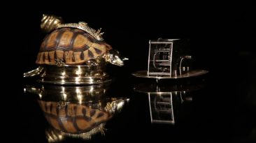 Diese mechanische Schildkröte besteht aus einem echten Schildkrötenpanzer auf einem silbervergoldeten Sockel mit silbernem Kopf und Beinen, die...